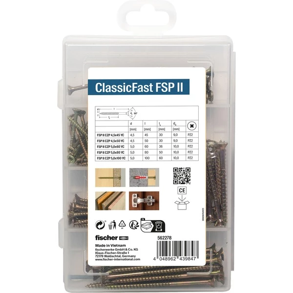La fischer MEISTER-BOX avec gamme de vis 562278 contient 110 vis à tête contre-enfoncées pré-triées FSP II CZP YC en cinq tailles différentes. La fischer FSP II CZP YC est une vis en aggloméré galvanisée jaune passivée avec tête contre-enfoncée et filetage partiel. La vis en aggloméré particulièrement économique convient au traitement universel dans de nombreux bois. La tête d’abaissement avec fente transversale d’entraînement PZ permet le positionnement simple et sûr de l’outil dans la tête de vis et peut être enfoncée au ras de la surface dans le bois. La version avec filetage partiel permet de tirer fermement les éléments en bois ensemble. En raison de la conformité CE, les vis offrent une sécurité permanente.