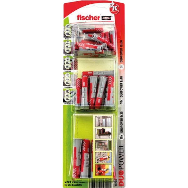 L’ensemble de chevilles fischer DUOPOWER 6/8/10 contient 15 DUOPOWER 6×30, 10 DUOPOWER 8×40 et 5 DUOPOWER 10×50 pré-triés. Le goujon universel fischer DUOPOWER offre de très bonnes valeurs de maintien à travers 2 composants : Selon le matériau de construction, le composant gris en nylon de haute qualité active automatiquement le principe de fonctionnement optimal (étalement, volets, nœuds) pour une meilleure adhérence. Les ailes d’expansion du composant rouge soutiennent l’épandage en toute sécurité et offrent une sécurité supplémentaire au composant gris. Les dispositifs co-rotatifs prononcés s’imbriquent dans le matériau de construction et empêchent la rotation dans le trou de forage. L’ouverture fluide assure une fixation facile de la vis et un guidage et une fixation sécurisés dans le canal de vis. Le fischer DUOPOWER empêche la vis de se renverser et donne le meilleur retour possible (facteur de bien-être) de la cheville. Vous pouvez sentir que le goujon s’adapte parfaitement. Le bord formé sur la tête du goujon empêche également le goujon de glisser dans le trou de forage. Les DUOPOWER 6/8/10 conviennent, par exemple, aux rideaux de douche, aux bacs à savon ou aux porte-papier toilette.