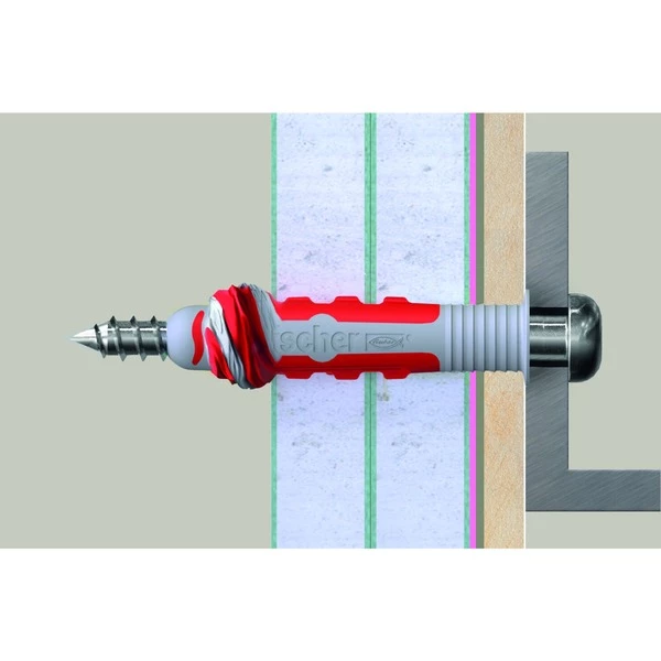Le fischer DuoSeal est un goujon à 2 composants qui scelle le trou de forage (en conjonction avec la vis incluse dans l’ensemble) sans silicone. Le DuoSeal scelle complètement les forages dans les carreaux sans composé d’étanchéité supplémentaire et évite ainsi les dommages structurels causés par l’humidité dans le matériau de construction. Le DuoSeal est idéal pour les surfaces carrelées qui sont exposées à des éclaboussures d’eau très fréquentes et à l’accumulation temporaire d’eau, telles que les bains, les cuisines, les espaces bien-être, les piscines, les installations sportives, les saunas ou les buanderies. Le goujon universel peut être facilement monté sans martelage, respectueux des carreaux. Son composant rouge en nylon de haute qualité assure une prise sûre dans tous les matériaux de construction. Ainsi, le DuoSeal atteint les mêmes valeurs de charge que les chevilles en plastique conventionnelles. Les vis en acier inoxydable fournies sont idéales pour les zones humides et évitent les traces de rouille. Le bord en plastique souple de l’arbre du goujon ferme parfaitement le trou de forage et s’adapte à la forme de l’accessoire. Le fischer DuoSeal convient à la fixation d’accessoires de salle de bain, d’accessoires, de cabines de douche, de miroirs, de supports de sèche-cheveux, de porte-tuyaux et bien plus encore.