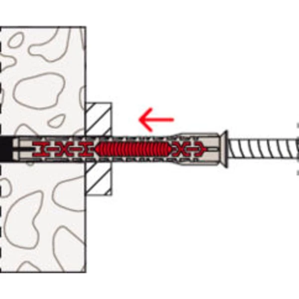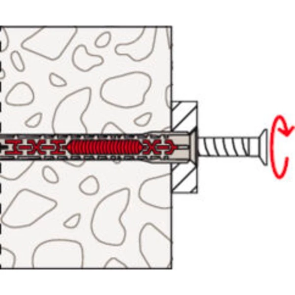 Le goujon à long arbre fischer DuoXpand 10×120 T R à géométrie lamellaire spéciale s’étale doucement dans le matériau de construction et évite ainsi les ruptures dans les matériaux de construction poreux. Cela signifie que les ancrages proches du bord sont également possibles sans aucun problème. Le corps de base gris en nylon de haute qualité offre un soutien solide, tandis que le composant flexible en matériau rouge assure un étalement optimal. Le DuoXpand convient au montage par trou traversant. Dans les matériaux de construction solides, la conception coordonnée du produit offre une répartition uniforme de la charge dans le sous-sol, et dans la maçonnerie de pierre perforée, les lattes s’étendent sur le pont de pierre et forment une contre-dépouille dans la cavité. La version avec vis de tête contre-enfoncée en acier inoxydable est particulièrement adaptée à la fixation de structures en bois, de sous-structures de façade, d’abris d’auto, de auvents en bois, de supports de télévision ou de cadres de fenêtres. La vis de sécurité pré-assemblée est parfaitement adaptée à la cheville à arbre long DuoXpand 10×120 T R et permet de gagner du temps lors de l’assemblage.