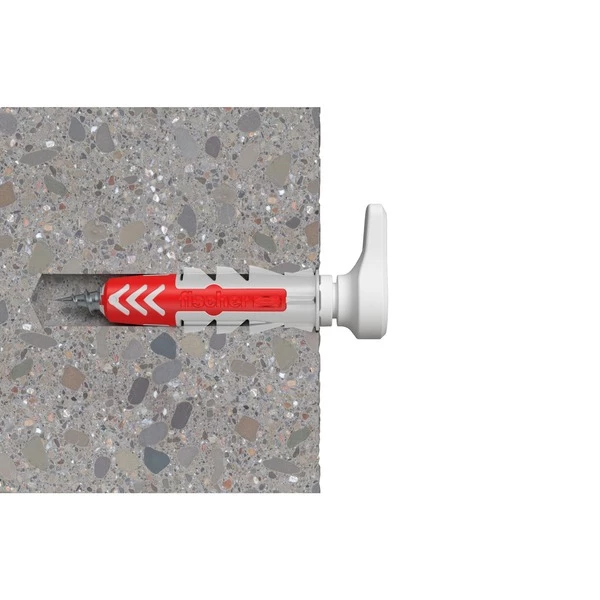 L’ensemble EasyHook Angle DuoPower 8×40 contient quatre chevilles DuoPower 8×40, quatre vis assorties et quatre crochets d’angle EasyHook. L’EasyHook attachable se monte rapidement et facilement avec le tournevis sans fil. En raison du point de rupture prédéterminé, le crochet peut être aligné de manière flexible et peut être monté à différentes distances du mur en fonction de la profondeur de vissage. Le plastique renforcé de fibres de verre assure un niveau de charge élevé et une tenue sûre. Le crochet en plastique peut être utilisé avec le DuoPower en maçonnerie ou sans chevilles en bois, qui recouvre une variété de matériaux de construction. La cheville universelle fischer DuoPower 8×40 offre de très bonnes valeurs de maintien grâce à 2 composants : Selon le matériau de construction, le composant gris en nylon de haute qualité active automatiquement le principe fonctionnel optimal (étalement, volets, nœuds) pour une meilleure adhérence. Les ailes d’expansion du composant rouge soutiennent l’épandage en toute sécurité et offrent une sécurité supplémentaire au composant gris. Les dispositifs co-rotatifs prononcés s’imbriquent dans le matériau de construction et empêchent la rotation dans le trou de forage. L’ouverture fluide assure une fixation facile de la vis et un guidage et une fixation sécurisés dans le canal de vis. Le fischer DuoPower empêche la vis de se renverser et donne le meilleur retour possible (facteur de bien-être) de la cheville. Vous pouvez sentir que le goujon s’adapte parfaitement. Le bord formé sur la tête du goujon empêche également le goujon de glisser dans le trou de forage. Le DuoPower 8×40 en combinaison avec le crochet d’angle EasyHook convient par exemple pour les images, les étagères murales lumineuses, les objets décoratifs, les armoires suspendues à la lumière, les miroirs ou les chaînes.