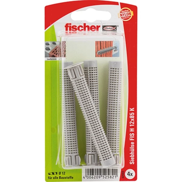 Le manchon d’ancrage d’injection fischer FIS H K plastique est un composant du système pour l’utilisation du mortier d’injection fischer dans la maçonnerie en pierre perforée. Le manchon d’ancrage est inséré dans le trou de forage et rempli de mortier d’injection à partir du fond du manchon d’ancrage. Lors du vissage de la tige d’ancrage ou de l’ancrage fileté interne, le mortier est pressé à travers les parois en treillis et relie le raccord de forme à la pierre perforée. La géométrie des manchons d’ancrage permet également le pontage de couches non porteuses pour une installation pratique et facile. La structure en treillis du manchon d’ancrage FIS H K est adaptée au mortier d’injection FIS V, au mortier multifonctionnel, au mortier d’assemblage FIS VL ou au mortier d’assemblage GREEN et permet une consommation économique du mortier et un ajustement optimal de la forme. Les lames de centrage alignent l’élément de fixation dans le manchon d’ancrage et permettent l’utilisation de différents diamètres de tige d’ancrage. Les barbes maintiennent fermement le manchon d’ancrage dans le trou de forage et permettent ainsi un montage aérien sans problème.