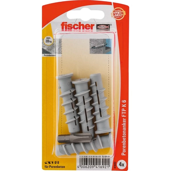L’ancrage en béton cellulaire fischer Turbo FTP K est une cheville spéciale pour la fixation d’accessoires légers dans du béton cellulaire. La cheville, en nylon de haute qualité, est placée dans l’ensemble pré-plug après pré-perçage avec l’outil de réglage FTP EK. Le fil mâle en forme de spirale coupe l’ajustement de forme dans le matériau de construction. Le goujon convient à la fois aux vis à bois et aux vis métriques et permet ainsi une sélection flexible des vis. La géométrie spéciale assure un ancrage presque sans pression étalée. Cela permet de petites distances de bord et d’axe et évite l’écaillage sur les surfaces plâtrées. L’ancrage en béton cellulaire fischer Turbo FTP K est idéal pour fixer en toute sécurité les colliers de serrage de câbles et de tuyaux dans le béton cellulaire, par exemple.