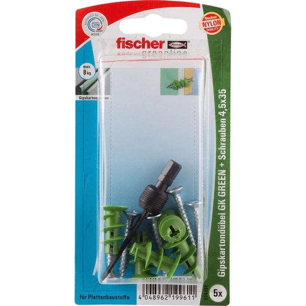 Le goujon en plaques de plâtre fischer GK GREEN S présente les mêmes caractéristiques de performance et la même capacité portante que l’original de couleur grise. Au moins 50% des granulés utilisés pour produire le goujon sont obtenus à partir de matières premières renouvelables qui ne concurrencent pas les zones de culture pour l’alimentation humaine et animale. Le goujon en plaques de plâtre GK GREEN S est vissé dans une plaque de plâtre au ras de l’outil de réglage attaché avec un tournevis sans fil dans le montage pré-plug. Jusqu’à 15 mm d’épaisseur de plaque, aucun pré-perçage n’est nécessaire. Le filetage autotaraudeur pointu crée une connexion de forme et assure une capacité de charge élevée. Grâce à la fente transversale dans la tête de cheville, le GK GREEN peut également être démonté comme une vis sans outil vissé si nécessaire. Il peut être utilisé avec diverses vis, crochets et œillets et est très polyvalent à utiliser. Le fischer GK GREEN S est fourni complet avec vis en aggloméré et convient à la fixation rapide et rapide d’installations électriques ou d’accessoires d’ameublement.
