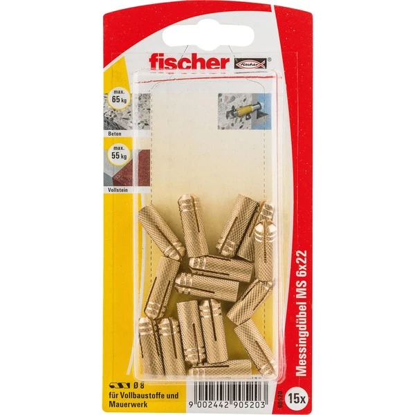 Le goujon en laiton fischer MS 6×22 est un goujon d’étalement pour accueillir un filetage métrique M6. La cheville spéciale est placée dans un montage pré-plug. Lors du vissage d’une vis ou d’une tige filetée, le goujon en laiton s’ouvre et s’ancre fermement contre le mur du trou de forage. La structure de surface spéciale du goujon en laiton empêche le tournage dans le trou de forage, ce qui permet d’obtenir une plus grande fiabilité de montage. La conception compacte de la cheville en laiton réduit l’effort de perçage et permet une installation rapide. Le filetage interne permet l’utilisation de vis métriques ou de tiges filetées disponibles dans le commerce et, si nécessaire, assure le démontage de la pièce de fixation et la réutilisabilité du point de fixation. Le goujon en laiton fischer MS 6×22 convient, par exemple, pour la fixation d’étagères de cave, de sous-structures en bois et en métal, de chauffe-eau instantanés, d’agrégats ou d’armoires de commande en matériaux de construction solides.