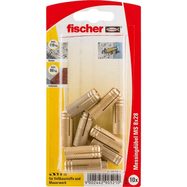 Le goujon en laiton fischer MS 8×28 est un goujon d’étalement pour maintenir un filetage métrique M8. La cheville spéciale est placée dans un montage pré-plug. Lors du vissage d’une vis ou d’une tige filetée, le goujon en laiton s’ouvre et s’ancre fermement contre le mur du trou de forage. La structure de surface spéciale du goujon en laiton empêche le tournage dans le trou de forage, ce qui permet d’obtenir une plus grande fiabilité de montage. La conception compacte de la cheville en laiton réduit l’effort de perçage et permet une installation rapide. Le filetage interne permet l’utilisation de vis métriques ou de tiges filetées disponibles dans le commerce et, si nécessaire, assure le démontage de la pièce de fixation et la réutilisabilité du point de fixation. Le goujon en laiton fischer MS 8×28 convient, par exemple, à la fixation d’étagères de cave, de sous-structures en bois et en métal, de chauffe-eau instantanés, d’agrégats ou d’armoires de commande en matériaux de construction solides.