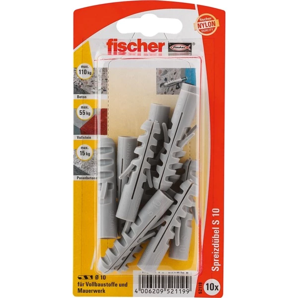 Le goujon d’épandage fischer S 10 K en nylon de haute qualité est le classique éprouvé depuis des décennies. Il est particulièrement robuste lors de l’assemblage et assure une sécurité à long terme. Étant donné que la cheville ne se propage que dans deux directions, les forces d’étalement peuvent être introduites parallèlement au bord du matériau de construction en tournant la cheville. Cela empêche le matériau de construction de s’écailler lorsqu’il est fixé près du bord. La géométrie mince de la cheville permet une insertion facile dans le trou de forage pour une installation rapide et facile. La cheville d’épandage fischer S 10 K est idéale pour la fixation en béton et en maçonnerie en pierre solide.