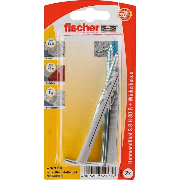 Le goujon fischer frame S 8 H RW en nylon de haute qualité est particulièrement robuste lors de l’installation et assure une sécurité à long terme. Il convient à la fixation dans des matériaux solides et convient en raison de sa longueur pour combler les couches de plâtre jusqu’à une épaisseur maximale de 1 cm. Étant donné que la cheville de cadre S 8 H RW ne se propage que dans deux directions, les forces d’étalement peuvent être introduites parallèlement au bord du matériau de construction en tournant la cheville. Cela empêche le matériau de construction de s’écailler lorsqu’il est fixé près du bord. La géométrie mince du goujon permet également une insertion facile dans le trou de forage pour une installation rapide et facile. Le crochet d’angle fourni est spécialement adapté à la cheville de cadre S 8 H RW et permet ainsi de maintenir les valeurs.
