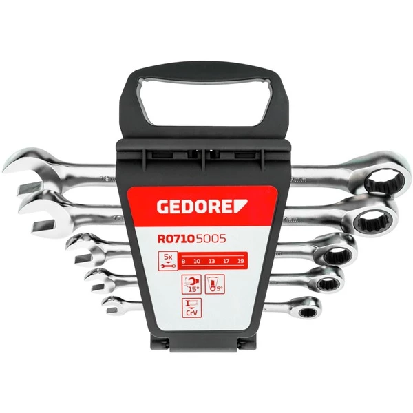 L’ensemble de clés à cliquet à anneau R07105005 de GEDORE Red contient 5 clés à cliquet à anneau avec les mêmes largeurs de clé des deux côtés dans un seul support. La tête du cliquet est droite. Le mécanisme à cliquet est finement denté avec 72 dents, l’angle de pivotement n’est que de 5°. Les touches sont en acier chrome-vanadium et chromées mates. La position de la bouche est de 15°. L’ensemble R07105005 est fabriqué conformément à la norme DIN 3113, ISO 3318 et contient des tailles courantes dans une composition pratique.
