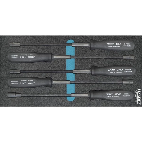 Le jeu de clés à douille flexible 163-461/5 de HAZET comprend un jeu de 5 pièces dans des largeurs de clés de 5 à 10. La gamme est fournie dans un insert en mousse HAZET Safety Insert System (SIS) dans le système de classification HAZET taille 1/3, adapté à tous les chariots d’atelier assistant avec tiroirs ou pour le SmartCase 165-L. Le système d’insertion de sécurité HAZET (SIS) est un système de classification parfait dans lequel tous les outils sont intégrés de manière résistante aux vibrations. Il permet un contrôle d’exhaustivité rapide et intégré, l’outil manquant est immédiatement remarqué. Les différentes tailles de systèmes de commande offrent des possibilités de combinaison infinies.