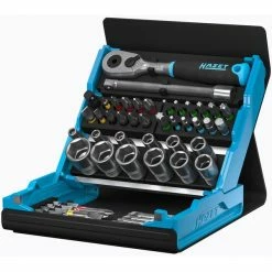 L’ensemble de bits 2200SC-2 de HazET se compose d’un cliquet de commutation HiPer de 1/4 « , de 12 bits longs, de 23 bits courts, d’un adaptateur de bits, d’une extension et de 12 écrous avec profil de traction HAZET. L’ensemble comprend des bits avec fente, fente croisée, TORX et profils de socket hexagonal. Les inserts de clé à douille hexagonale ont le profil de traction spécialement développé par HAZET pour les clés et les clés à douille sans arêtes vives ni pointes. La surface d’installation accrue du profil de traction dans la clé assure une transmission sûre du couple et réduit l’effet d’encoche au minimum. Cela protège de manière optimale la tête de vis contre les dommages et l’usure des coins. Même les vis endommagées et usées peuvent toujours être desserrées en toute sécurité avec le profil de traction, car il est presque impossible de tourner ou de glisser. L’ensemble de bits 2200SC-2 est fourni dans le SmartCase. Le SmartCase innovant permet un ensemble d’outils compact et pliable avec un matériau facilement essuyable et une sensation agréable. Il combine les avantages d’une coque textile mince et légère avec la robustesse des boîtes à outils à coque dure. Les supports de serrage robustes et durables empêchent les outils volants ou de vibrer et assurent un stockage stable et facilement accessible de nombreux outils dans les plus petits espaces avec la meilleure vue d’ensemble. La fermeture magnétique sans usure s’ouvre rapidement, l’outil est facile à retirer et le SmartCase peut être plié à plat ou configuré de la même manière qu’un étui pour tablette.
