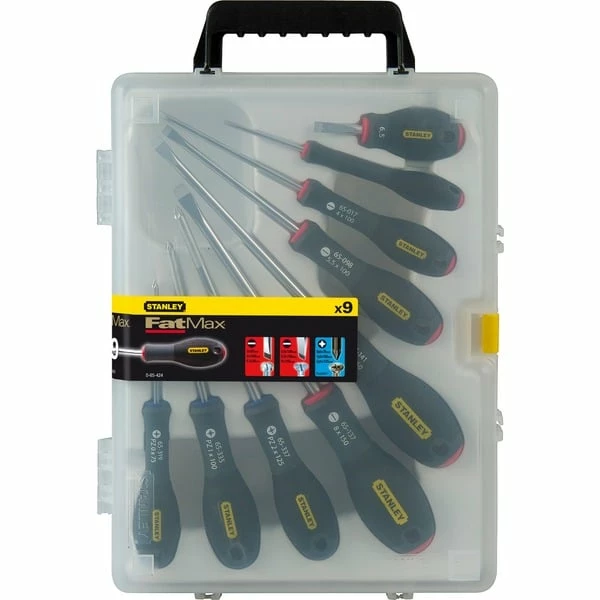 L’ensemble de tournevis FatMax 0-65-424 de Stanley contient neuf tournevis avec des poignées ergonomiques à poignée souple. La poignée de confort antidérapante avec des zones lisses et structurées se traduit par une combinaison optimale de confort de préhension élevé et d’utilisation ergonomique de la force. Il permet une adaptation optimale à la main et donc un couple de serrage maximal. La lame en acier de qualité chrome-vanadium offre une haute résistance et réduit le risque de rupture de la pointe. La poignée est appliquée directement sur la lame, ce qui rend la connexion de la lame et de la poignée pratiquement indestructible.