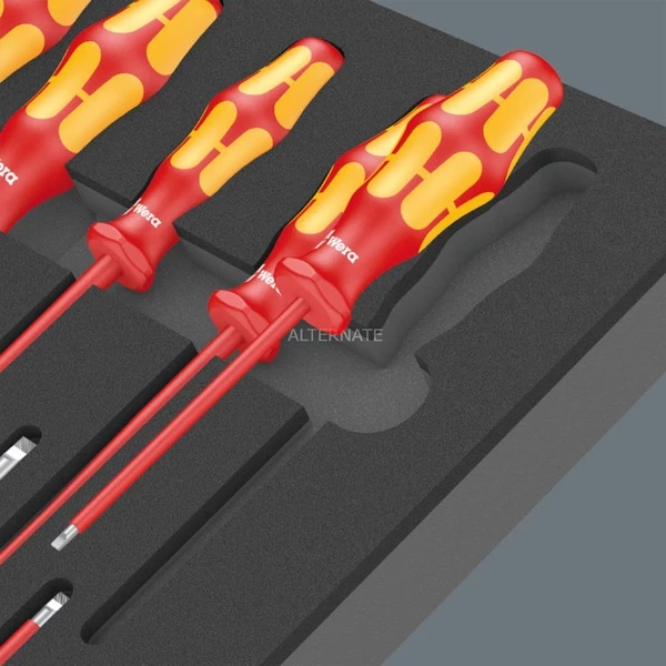 avec isolation de protection intégrée, avec laquelle des éléments de vis et de ressort bas peuvent être atteints. Au moyen de la lumière laser, une structure de surface à arêtes vives est créée à l’extrémité de la lame. Le traitement au laser provoque une dureté des traces allant jusqu’à 1000 HV 0,3. La surface micro-rugueuse mord fermement dans la tête de vis, assure un ajustement sûr du tournevis dans la vis et empêche de glisser hors de la tête de vis. Avec la poignée de forme de force multi-composants développée par Wera, toute la main trouve le contact avec la poignée. Les zones lisses et dures glissent à travers la main comme des roues lors de la préhension et permettent des vitesses de travail particulièrement élevées. Les zones souples et adhérentes sont des surfaces d’installation optimales pour la main et permettent une transmission de puissance élevée. Le marquage de la poignée avec le symbole de vis et la taille de la poignée facilite également la recherche dans le sac à outils et sur le lieu de travail. Dans l’insert en mousse durable de haute qualité sans évaporation chimique, chaque clé a sa place fixe. Grâce aux renfoncements à 2 couleurs, les outils manquants sont rapidement remarqués. L’insert en mousse est hydrofuge et oléofuge, facile à nettoyer, facile à nettoyer et protège l’outil contre la saleté ou les chocs. Les outils reposent solidement dans la mousse grâce à des découpes de contour précises, mais sont faciles à enlever.