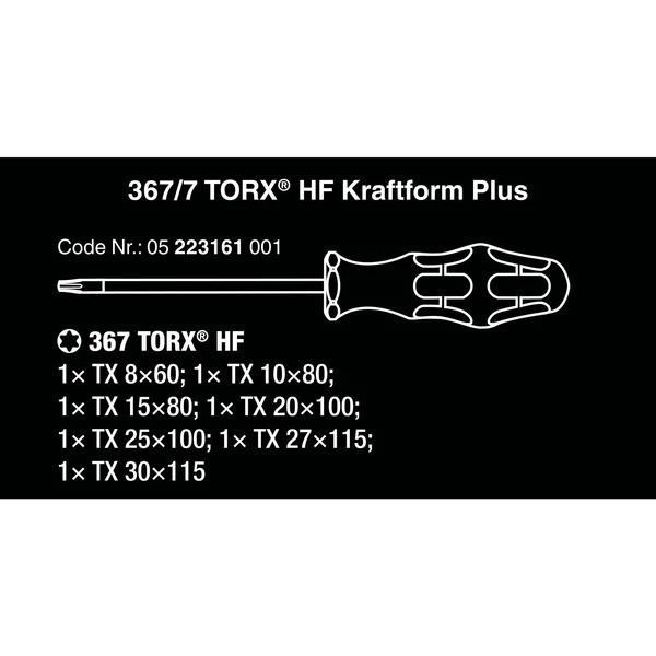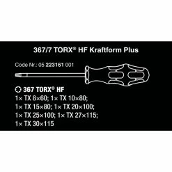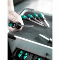 Le remplacement du tournevis Wera 367/7 TORX HF Kraftform Plus + Rack se compose de sept tournevis TORX avec fonction de maintien. Le profil TORX HF développé par Wera se caractérise par une optimisation géométrique du profil TORX original. En raison de la force de serrage résultant de la pression de surface entre la pointe de sortie et le profil de vis, les vis TORX sont maintenues solidement sur l’outil. Ceci est particulièrement utile dans les zones de travail difficiles d’accès, où vous ne pouvez pas utiliser la trotteuse pour tenir la vis. Avec la poignée de forme de force multi-composants développée par Wera, toute la main trouve le contact avec la poignée. Les zones lisses et dures glissent à travers la main comme des roues lors de la préhension et permettent des vitesses de travail particulièrement élevées. Les zones souples et adhérentes sont des surfaces d’installation optimales pour la main et permettent une transmission de puissance élevée. Le marquage de la poignée « Take it easy » avec un code couleur selon les profils facilite également la recherche dans le sac à outils et sur le lieu de travail. L’ensemble de tournevis est livré avec un rack qui peut être fixé au mur. Cela garantit un stockage approprié et un accès rapide.