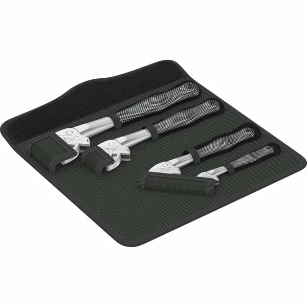 De nombreux utilisateurs souhaitent un outil de vissage universel avec un éventail d’applications le plus large possible. Un seul outil devrait suffire pour plusieurs dimensions métriques et impériales. Il faudrait qu’il s’adapte automatiquement aux différentes tailles de vis. Il faudrait qu’il agrippe fermement sans rien endommager et permette de travailler rapidement. Les mors parallèles réglables en continu remplacent plusieurs clés mixtes de dimension unique. La taille nécessaire se règle sans paliers automatiquement au contact des vis ou des écrous hexagonaux. Le mécanisme de levier intégré serre fermement la vis ou l’écrou entre les mors, ce qui réduit considérablement le risque de dérapage ou d’endommagement de la pièce. Grâce à la fonction cliquet, le vissage se fait rapidement, uniformément et sans désengagement de la clé. Les prismes permettent un angle de reprise de seulement 30°. La conception à une seule branche associée à la fonction cliquet et au prisme permet de travailler même dans les espaces réduits. La Joker6004 réglable est l’outil de vissage universel. Auto-ajustable. Dynamique. À cliquet. Jeu de 4pièces pour au moins 18emmanchements métriques et impériaux différents dans une pochette pliable compacte. Avec ses bandes à scratch au dos, elle peut se fixer au mur, sur une étagère ou une servante d’atelier et est compatible avec le système Wera 2go.