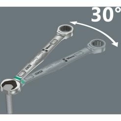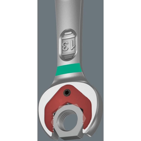 Clé double fourche haute qualité, métrique, signée Wera: Tout ce qu’une clé doit être capable de faire. Et bien davantage encore. En plus rapide, en mieux, en plus esthétique. Bref, un vrai Joker! La nouvelle génération des clés mixtes à cliquet. Pour vis à tête hexagonale/ écrous hexagonaux. Avec fonction de retenue assurée par une plaque métallique implantée dans la fourche, réduisant le risque d’égarer vis et écrous. La plaque métallique interchangeable située dans la fourche bloque les vis et les écrous grâce à ses dents extra-dures et diminue le risque de ripage. La butée terminale intégrée est à même d’empêcher le glissement vertical hors de la tête de vis et permet le déploiement de couples élevés. La morphologie dodécagonale engendre une liaison géométrique intime avec la vis ou l’écrou, réduisant le risque de ripage. L’angle de reprise de 30° seulement côté fourche permet d’éviter le retournement laborieux de la clé lors du vissage. Le forgeage à géométrie spécialement étudiée assure une transmission de couple élevée et une haute résistance à la flexion. Réalisation en acier chrome-molybdène performant, avec revêtement nickel-chrome pour une haute tenue à la corrosion. Avec repéreur d'outil « Take it easy » : identification des calibres par couleur.