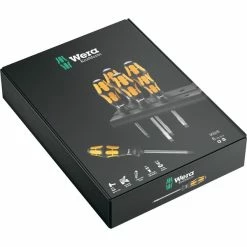 L’ensemble de tournevis Wera comprends des tournevis avec le Kraftforme de façon à ce que la poignée entre en contact avec l’ensemble de la main. Les zones lisses et durs vous permettent de travailler à des vitesses très élevées et peuvent être utilisés pour une meilleure transmission de puissance. Le matériau extrêmement dur à casser empêche l’éclatement ou la rupture de la lame, même battu avec un marteau. Par ailleurs, il peut également y être serrée au moyen d’un encastrement ou d’anneau, grâce à l’aide de la forme hexagonale au début de la poignée. La protection hexagonale empêche le roulement de votre tournevis dans le lieu de travail. L’ensemble est muni d’un râtelier qui peut être fixé à un mur, de sorte qu’une bonne conservation et un accès rapide peut être garantie.