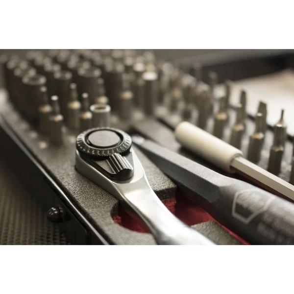 L’ensemble de bits Micro-Bit Set ESD 39971 de Wiha contient une gamme complète de micro-bits de 28 mm avec arbre de 4 mm, des inserts de clé à micro-douille de 30 mm avec arbre de 4 mm (en partie dans des tailles de pouce américains), un adaptateur de 1/4 « , une extension, un cliquet de bit de 90 mm avec molette de pouce 1/4 ” et la poignée du tournevis ESD. Les micro-bits conviennent aux vis particulièrement petites sur les appareils électroniques. La poignée ergonomique du tournevis ESD assure une protection maximale des composants électroniques. La résistance de surface électrostatique du matériau ESD est de 10^ 6 – 10^9 ohms. De cette façon, les composants sont protégés de manière fiable contre l’énergie électrostatique et les dommages associés. Le cliquet de mèche particulièrement pratique convient à une large gamme d’applications de vissage. L’angle de commutation minimum de seulement 5° permet de fixer le cliquet de bits même dans les espaces les plus étroits. Le mécanisme à cliquet finement denté avec 72 dents et la rotation gauche/droite, qui peut être changée via des leviers de commutation, sont d’autres avantages. Le Bit Set Micro-Bit Set ESD est logé dans un boîtier robuste avec insert en mousse.